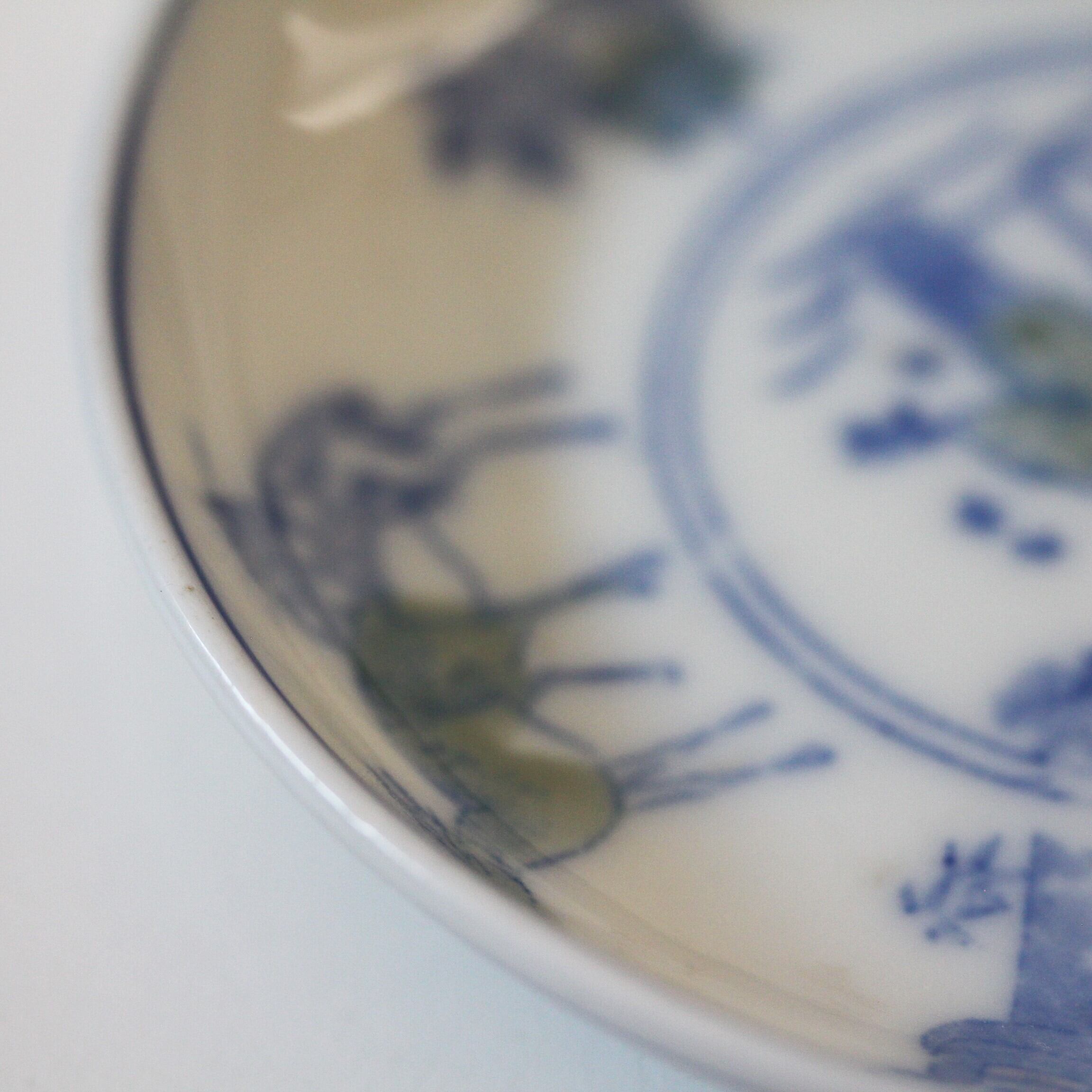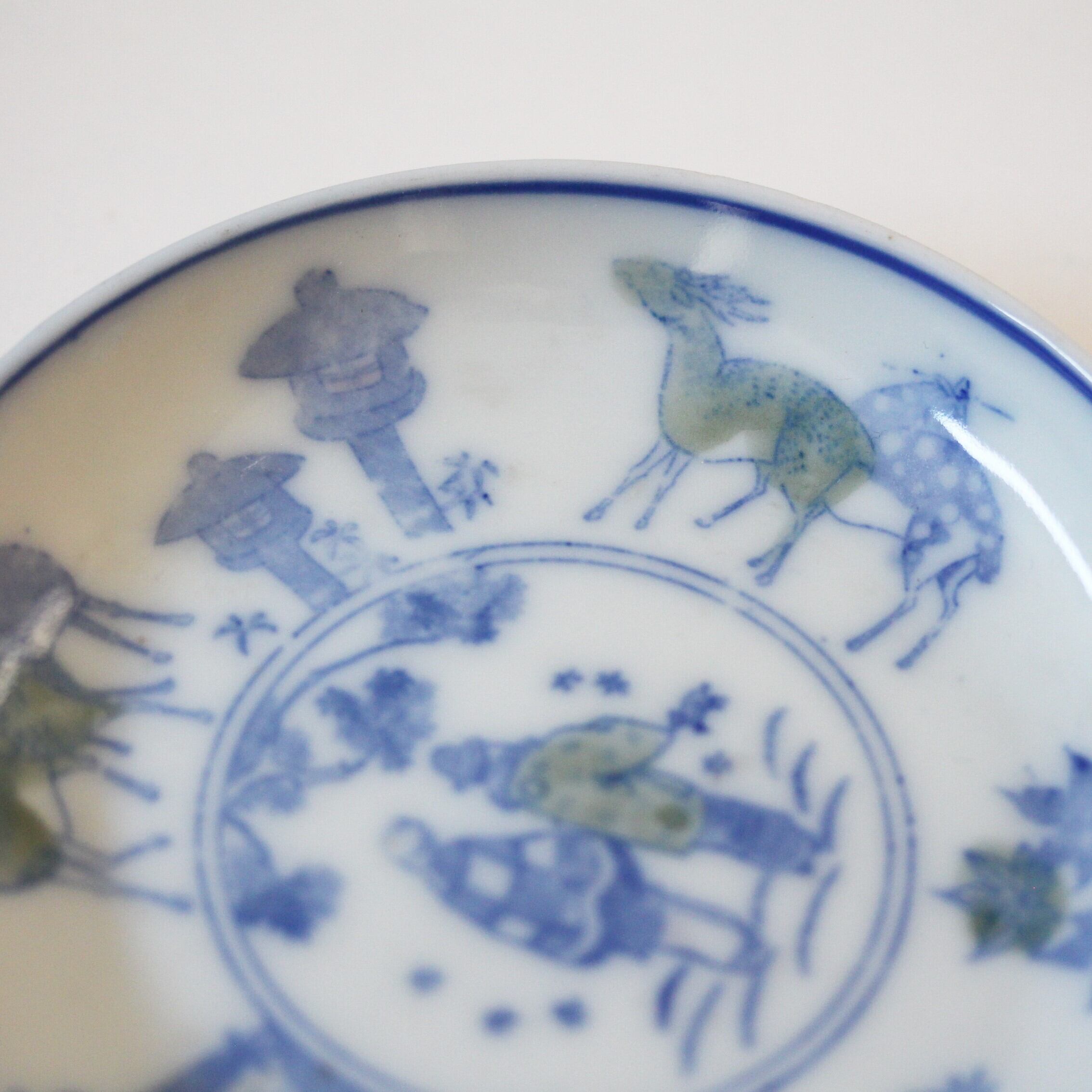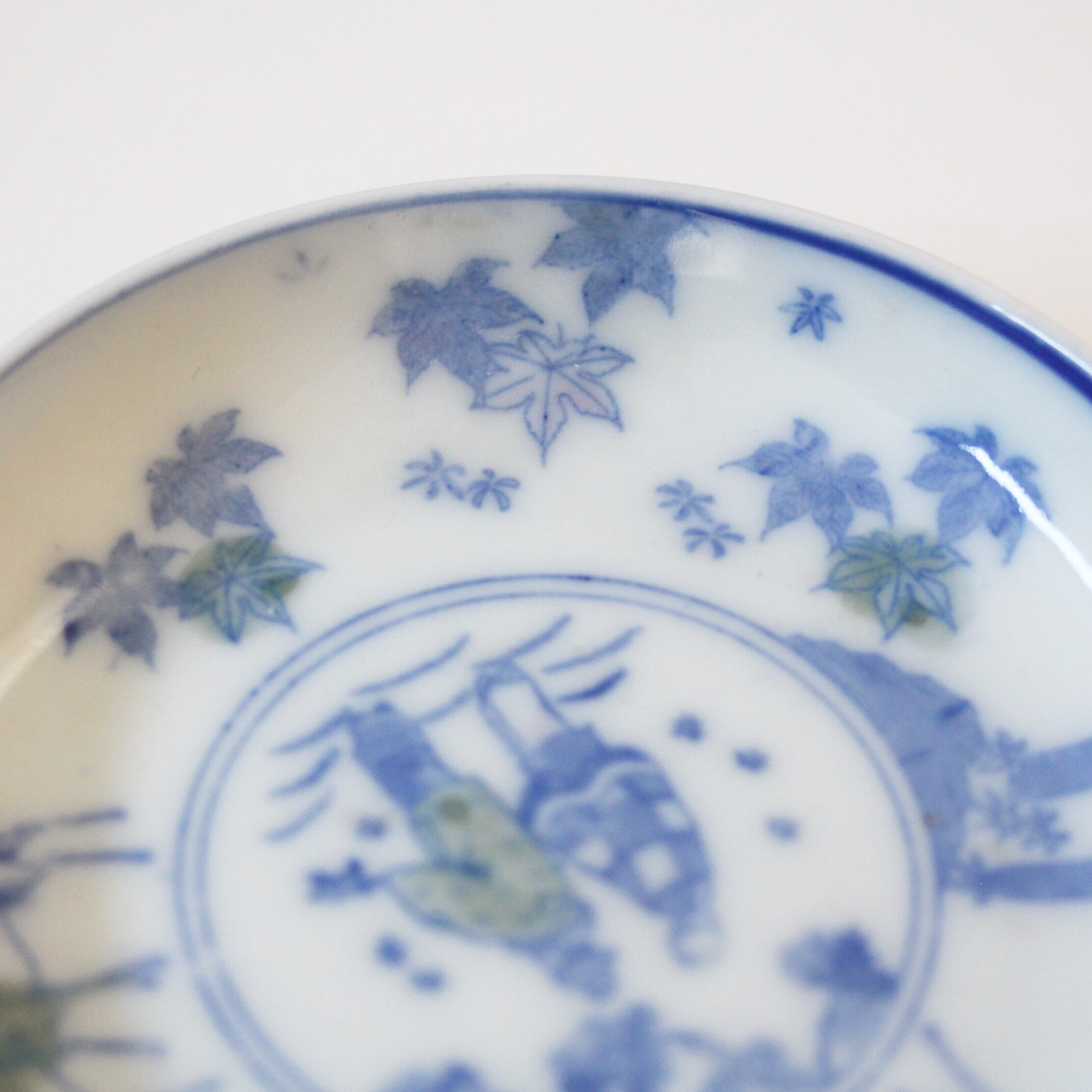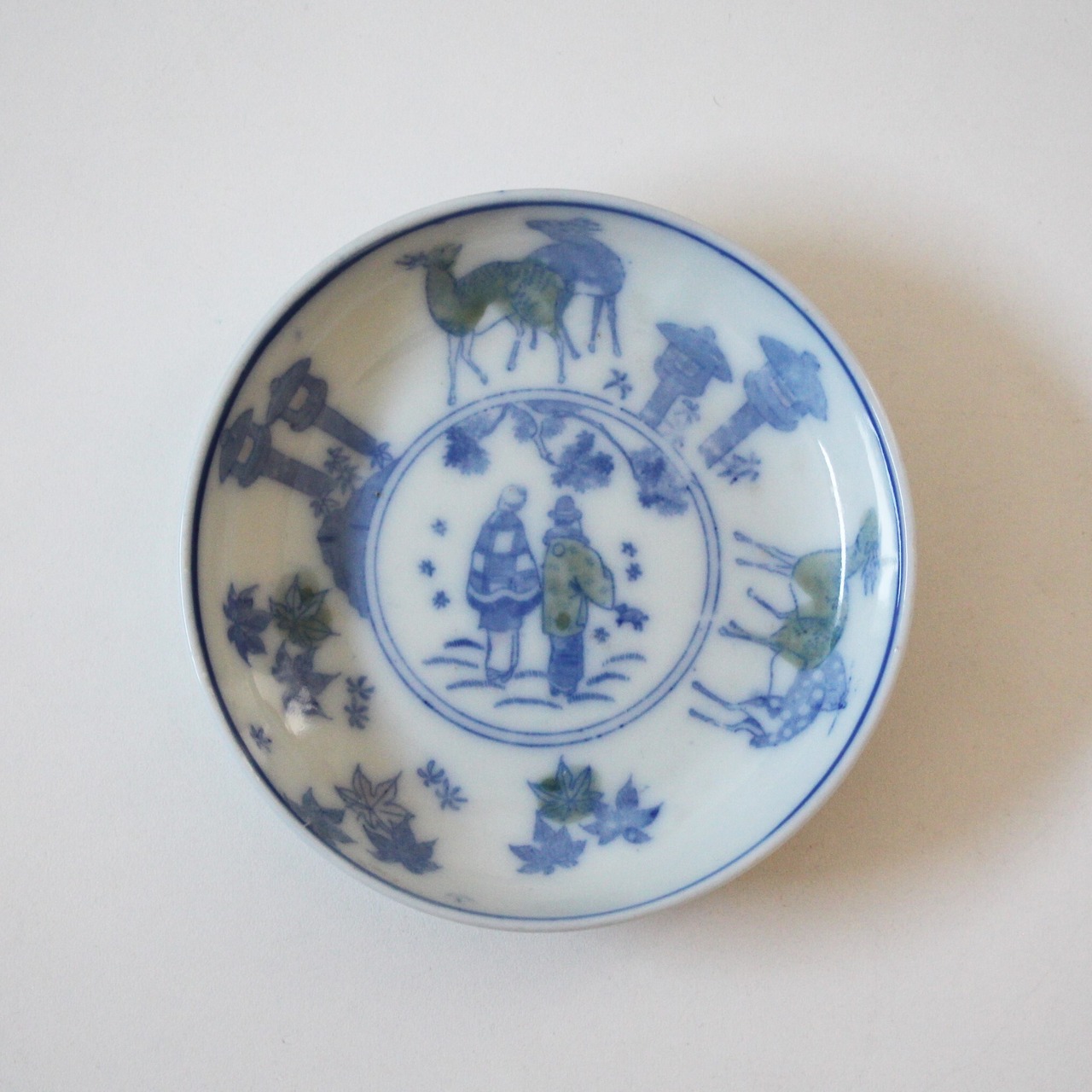 A charming small porcelain plate, with design of deer and momiji maple leaves. A man and a woman are painted (printed) in the center, and a fawn is seen very close to them.