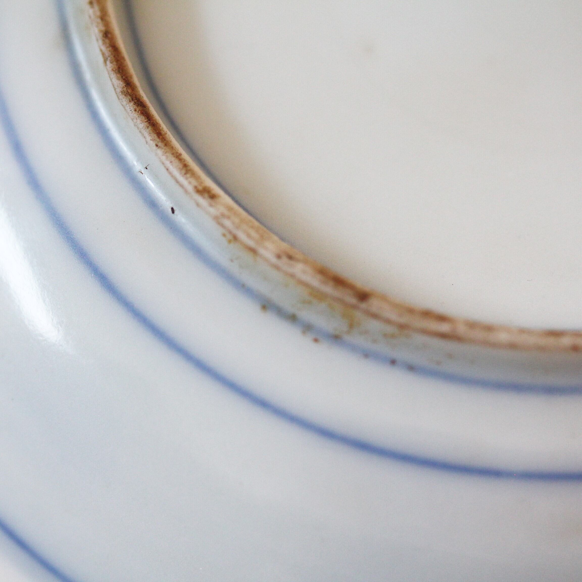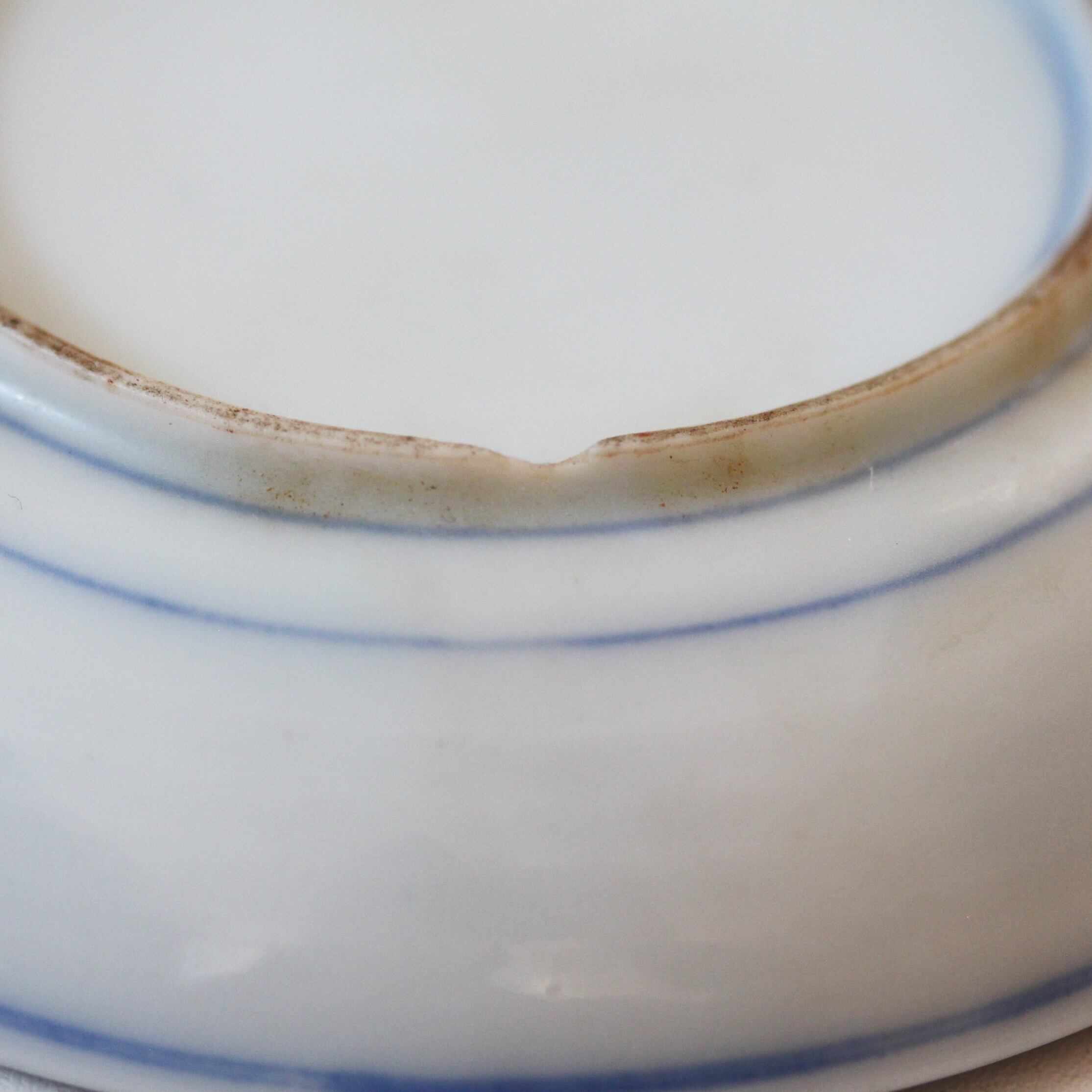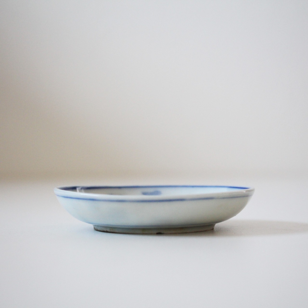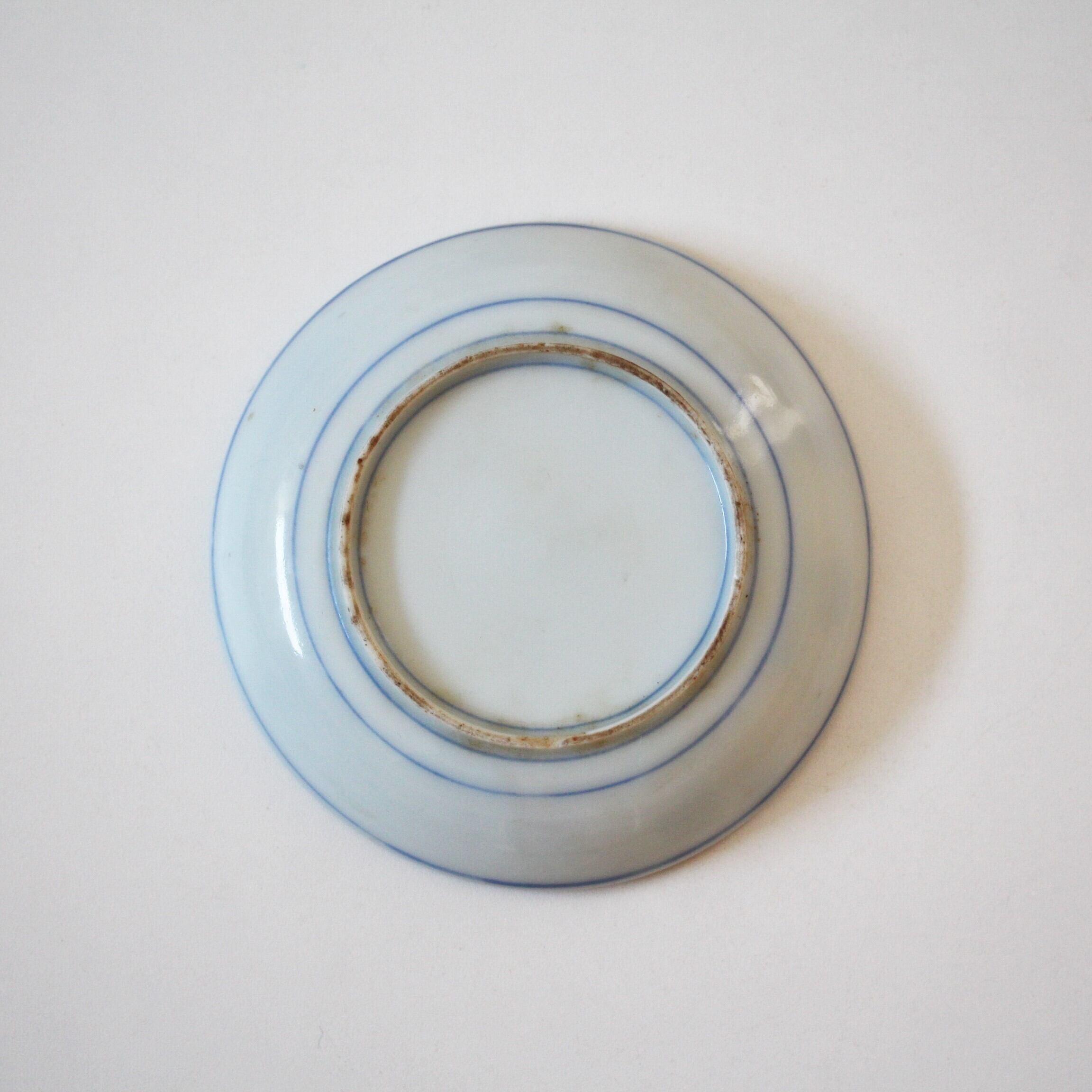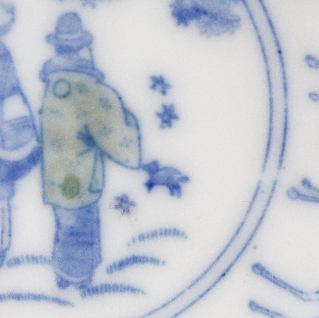 A charming small porcelain plate, with design of deer and momiji maple leaves. A man and a woman are painted (printed) in the center, and a fawn is seen very close to them.