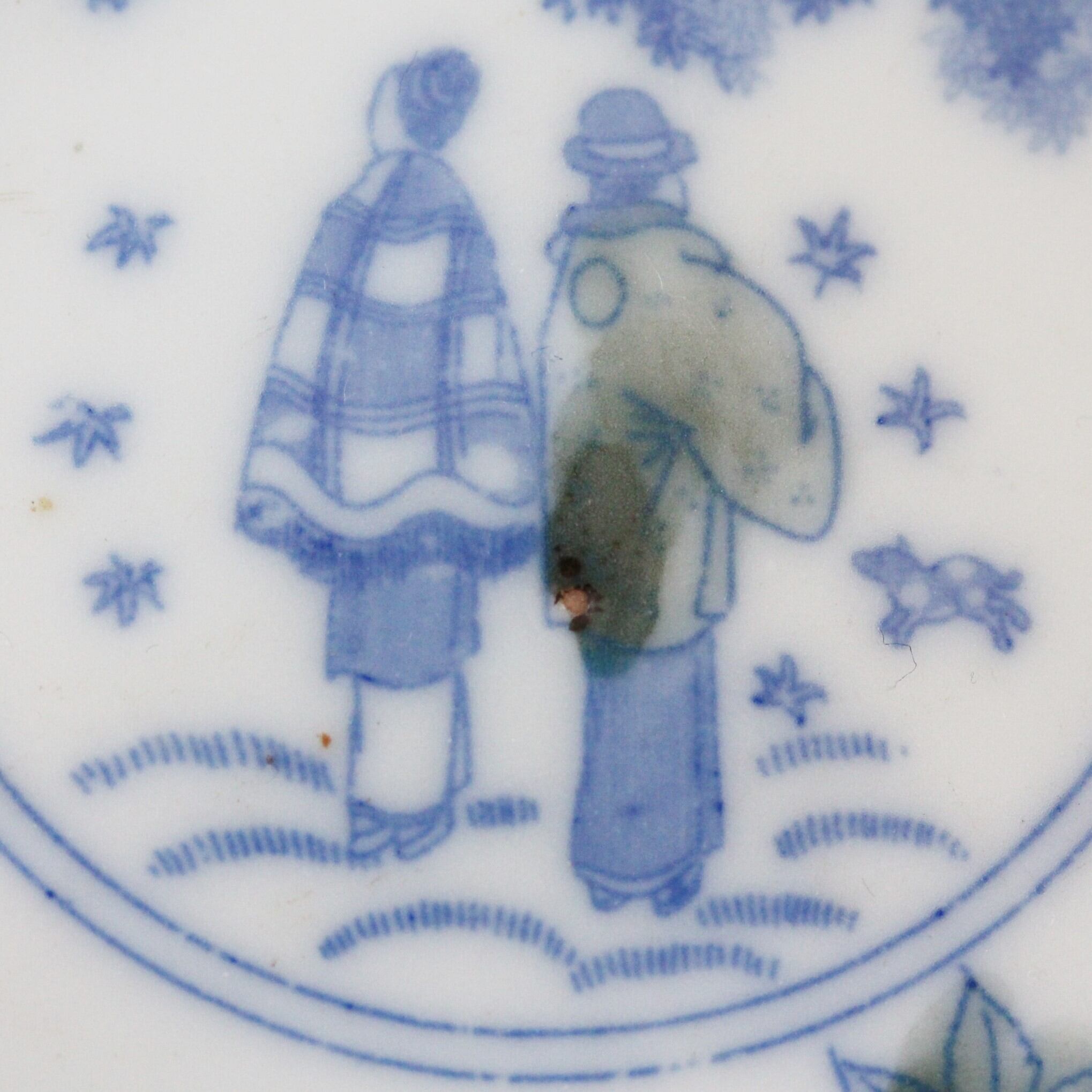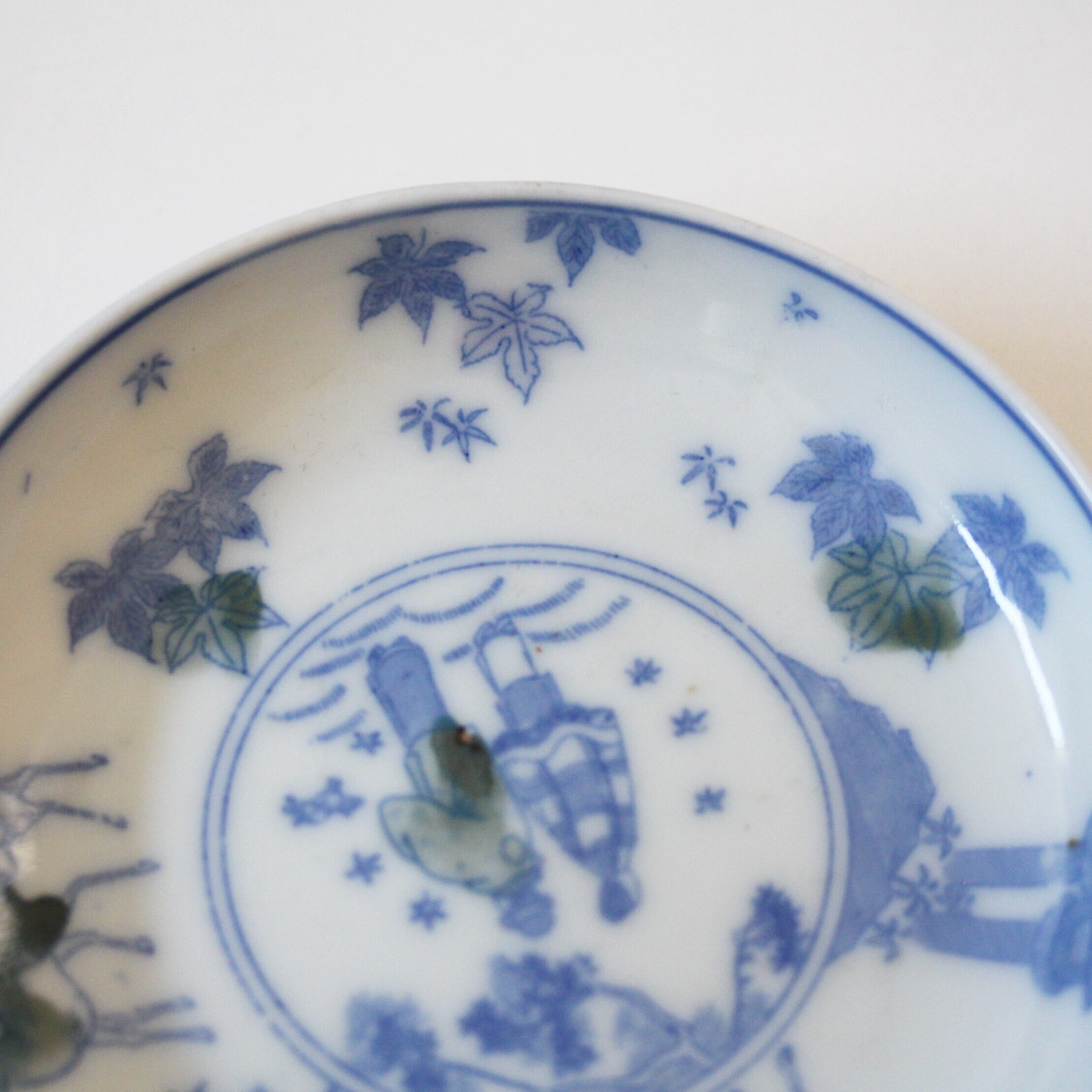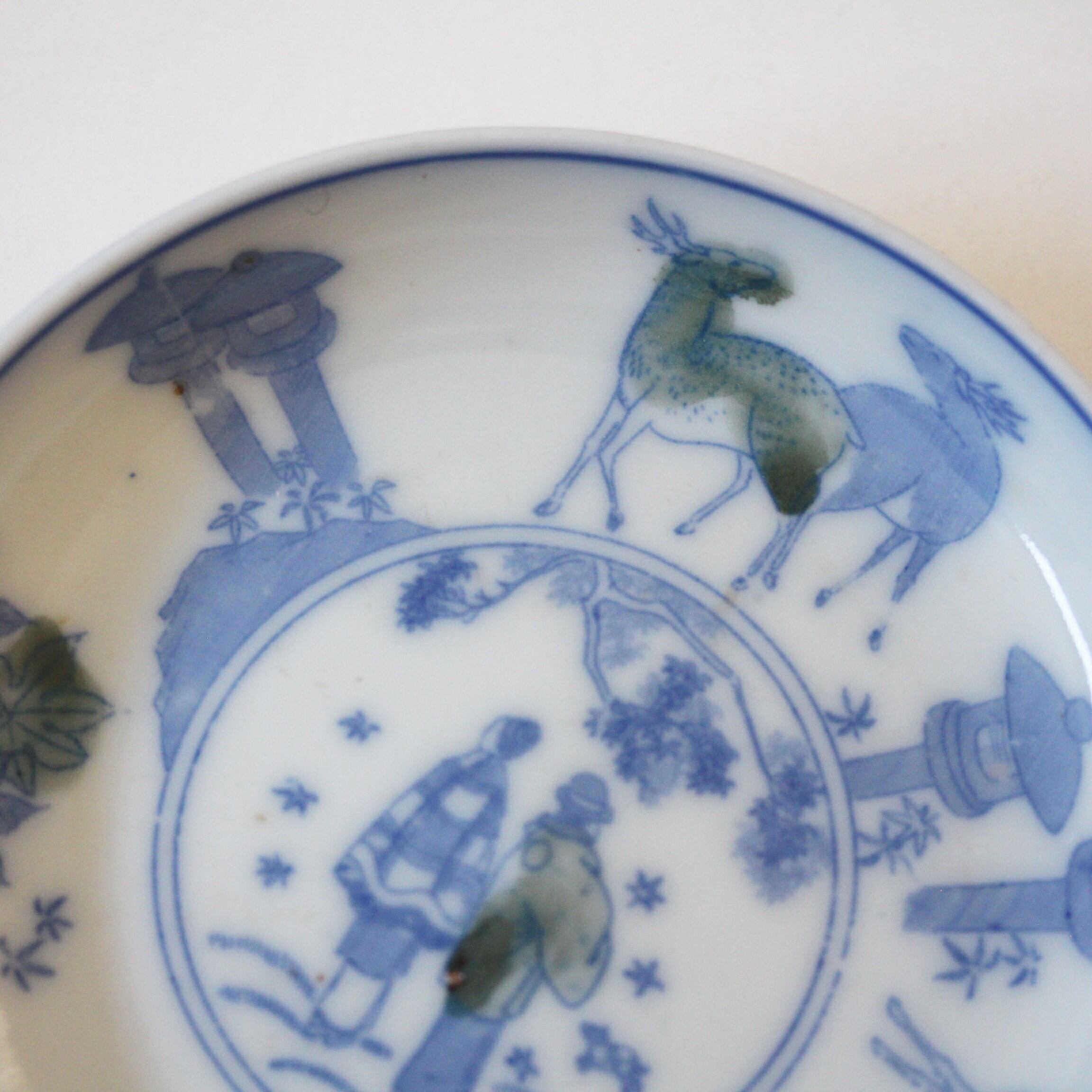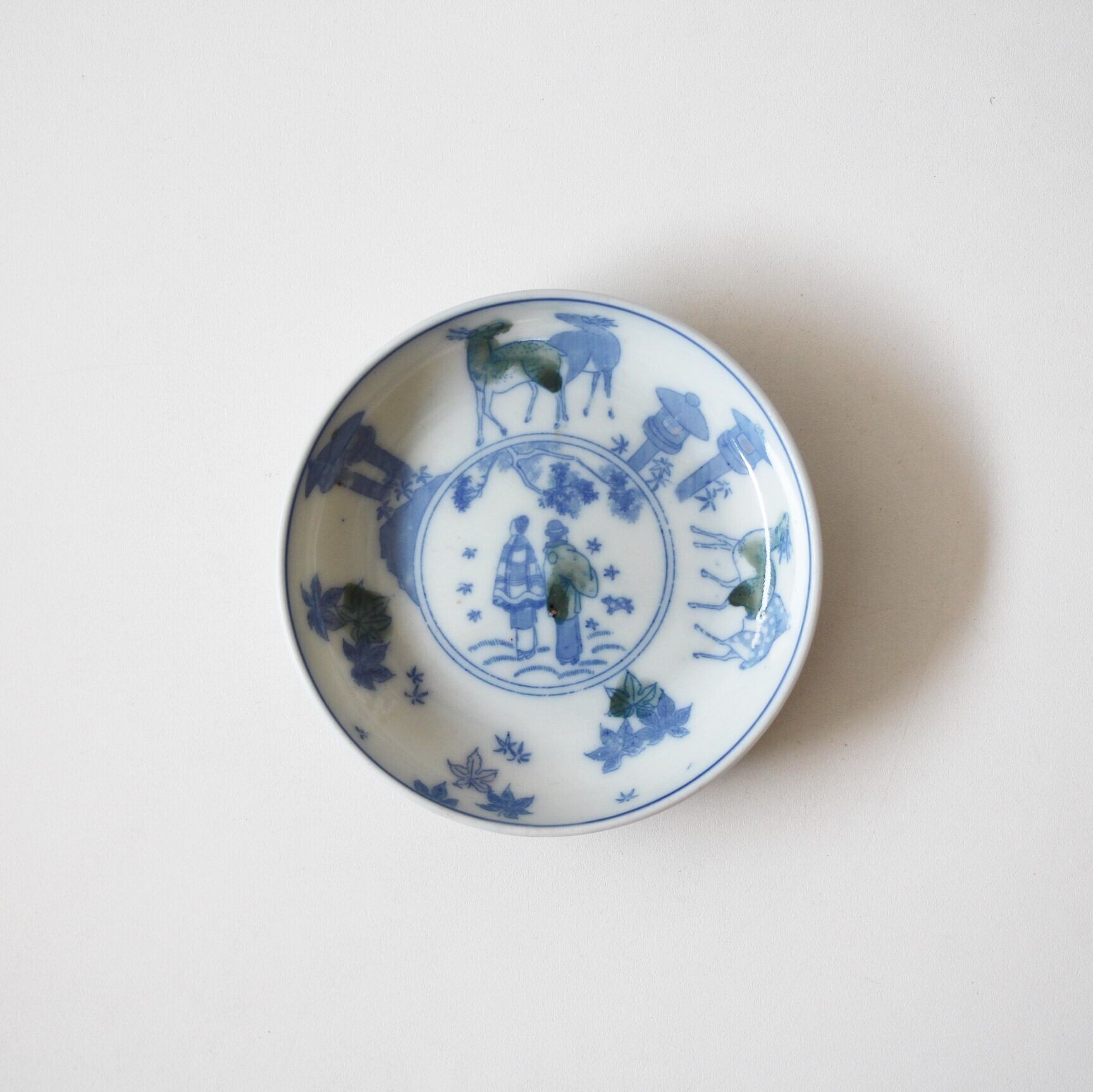 A charming small porcelain plate, with design of deer and momiji maple leaves. A man and a woman are painted (printed) in the center, and a fawn is seen very close to them.